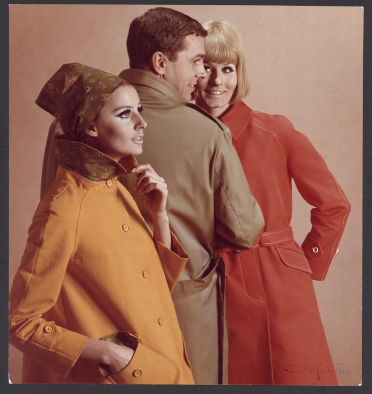 kvinna, man, jackor, färgbild, krage, blommönster, står, inomhus, bälte, sjal, gul, kvinnor, röd, brun, skärp, jacka, halvprofiler, halvprofil