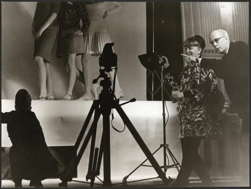 • Svartvit bild, tre kvinnor på podie. En man till vänster hukar sig framför podiet. Olofsdotter står till höger och håller i en strålkastare. Bakom Olofsdotter står en man och pekar över hennes axel.