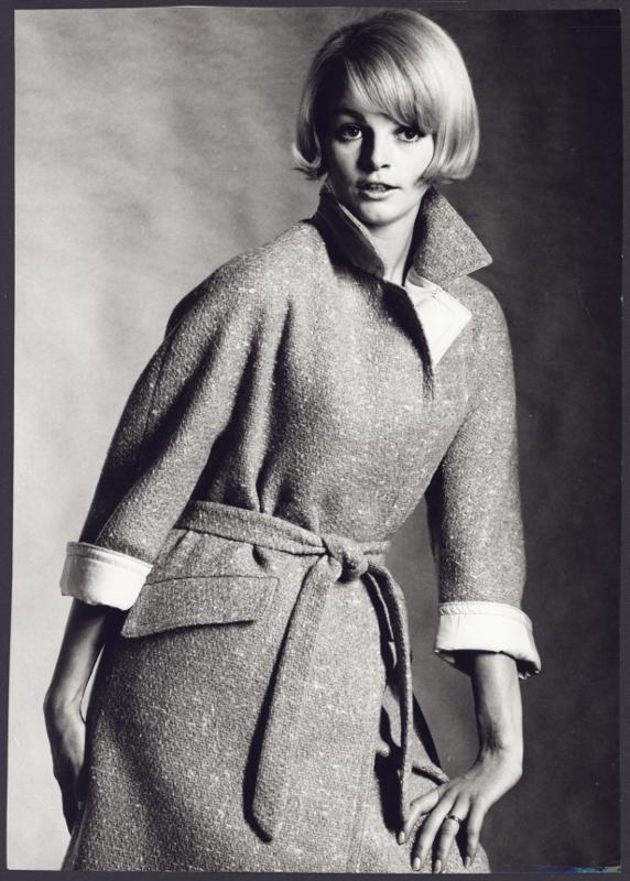 • Svartvit bild, kvinna i medelmörk jacka med skärp och uppvikta ärmar. Hon håller händerna vis sidan av sina lår och tittar rakt fram i kameran. Hon är blond.