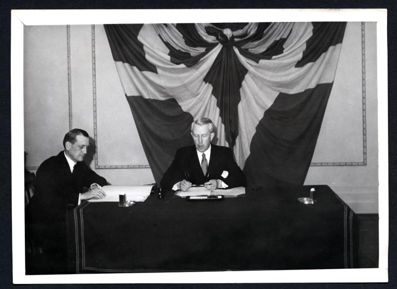 Svensk-dansk förening bildad i Malmö. Från det konstituerande sammanträdet i Kungsparkens restaurang i Malmö. Landshövding Arthur Thomson leder förhandlingarna. T.v. mötets sekreterare konsul, Herbert Dieden.