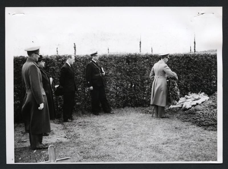 Engelsk flygarbegravning i Malmö. På Östra kyrkogården i Malmö jordfästes på onsdagen under militära hedersbetygelser, den vid Kåseberga förolyckade engelske flygaren, Flight Sergeant Frank Day. – Bilden visar överste af Sillén nerlägga krans från Malmö Fo. T.v. flottiljpastor Göte Kronvall förrättade jordfästningen, samt representanter för engelska legationen och konsulatet, samt svenska militära representanter.Stäng