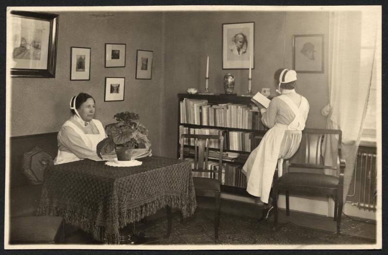 sjuksköterskamössa, sjuksköterskahätta, sjuksköterskor, sjuksköterska, bord, hätta, bokhylla, bok, stolar, uniformer, uniform, böcker, tavlor, mössa, duk