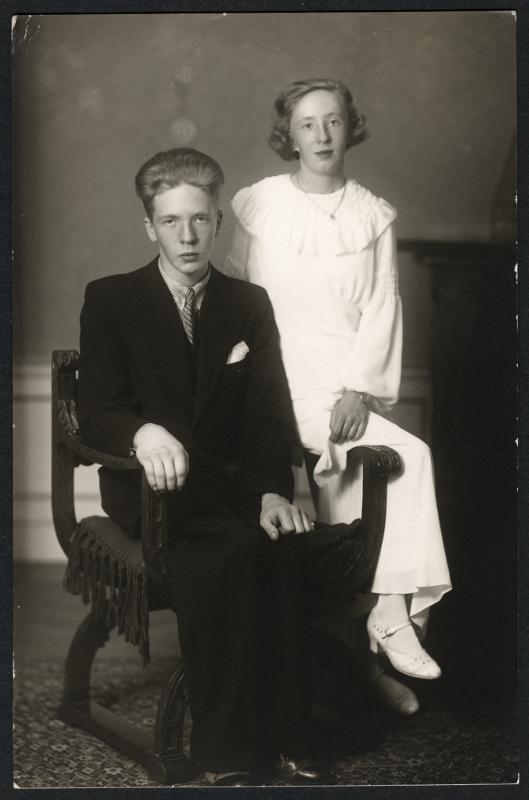 • Grupporträtt. Två ungdomar (Pojke och flicka). Vykort. - Okänd år