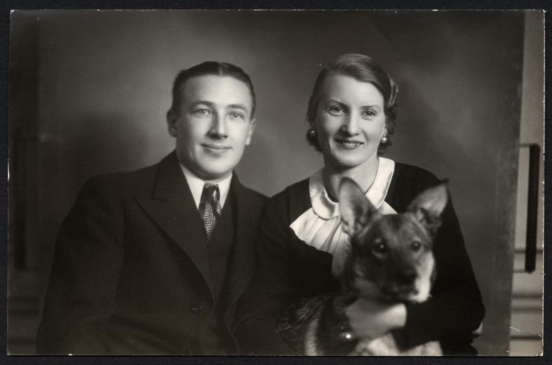 Grupporträtt. man och kvinna med hund, vykort.Okänt årtal.