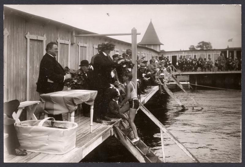 Grupporträtt, människor på kallbadhus.Okänt årtal.