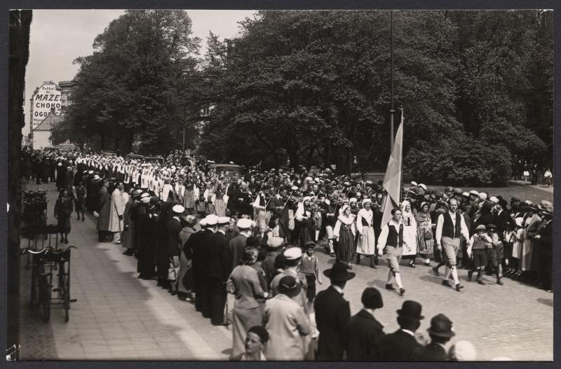 Personer i folkdräkt marscherar, åskådare, vykort.Okänt årtal.