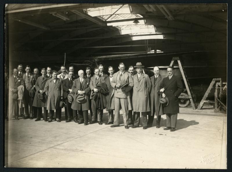 • Grupporträtt. En grupp människor i en flygplanshangar. - Okänd år