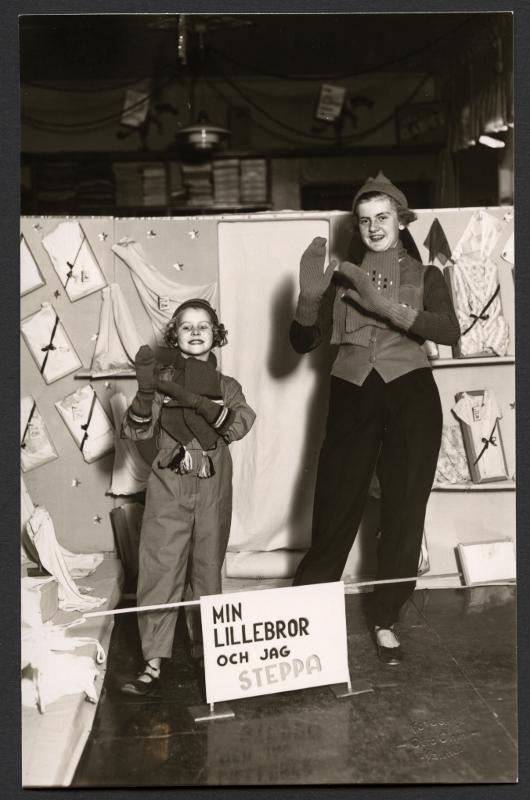 • I förgrunden en kvinna och ett barn iklädda mössor, vantar och halsdukar. En skylt med texten: Min lillebror och jag steppa. Div. klädesplagg monterade på väggen och liggandes på ett bord. Vykort. - Okänd år
