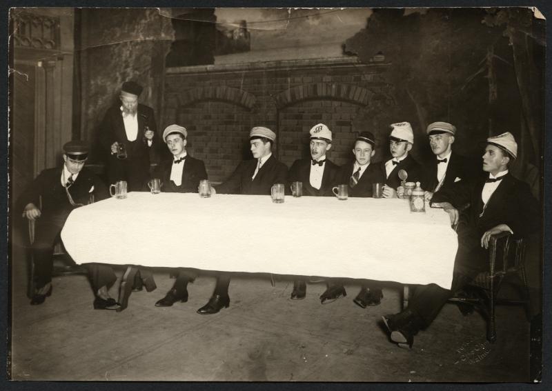 Malmö teater, amatörföreställning den 12-13 december 1925. Gamla Heidelberg av Meyer-Förster. Medverkande i "Gamle Hiedelberg" iförda scenkläder. Vykort.