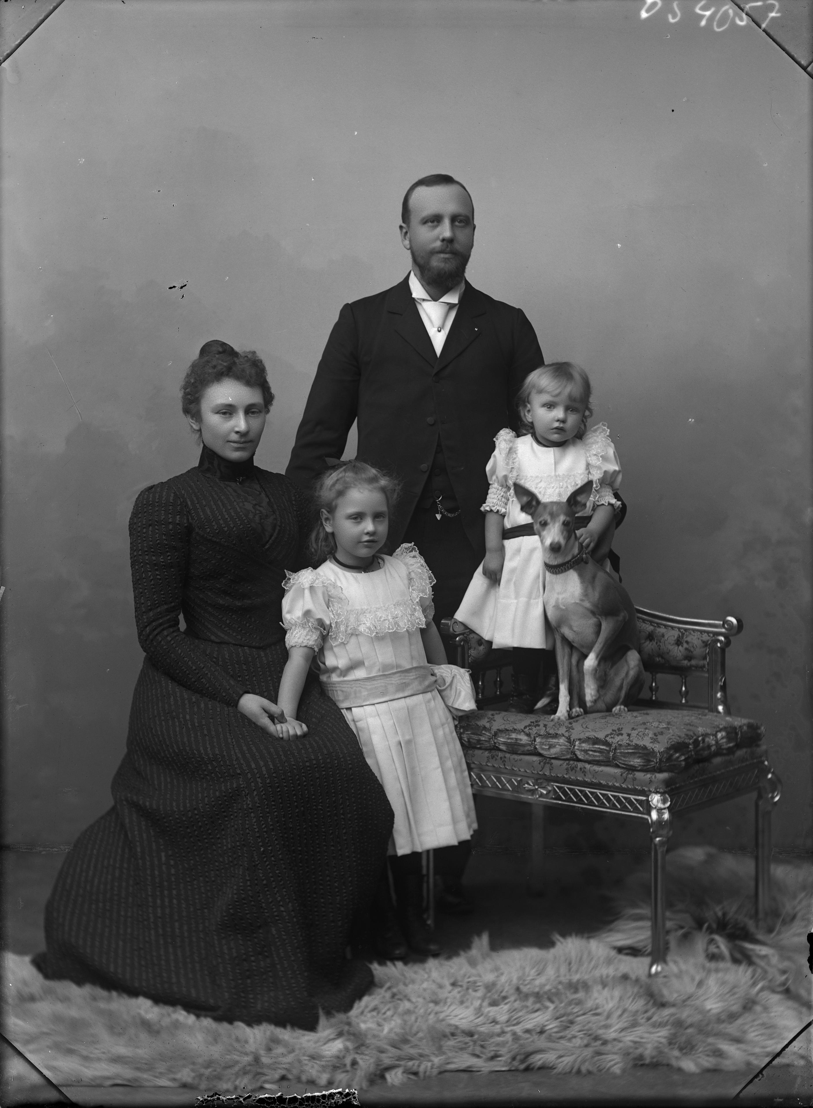 • Porträtt i helfigur av hattfabrikör och konsul Axel Berling med familj, frun Anna och döttrarna Greta och Lisa, samt familjens hund.