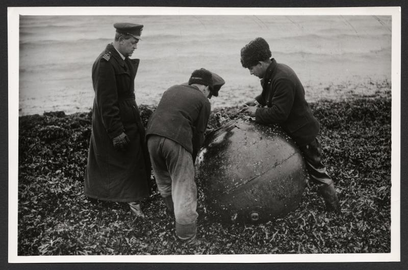 • Minfaran vid skånekusten. Drivande minor rapporteras dagligen. Många driver in mot stränderna. Bilden visar en av neutralitetsvakten omhändertagen mina vid Böste desarmeras, den 5 december 1939.