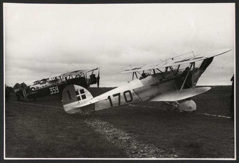 • Nordiska flygtävlingen. Maskiner i tävlingen under uppehållet på Ljungbyhed, den 22 maj 1936.