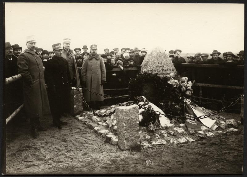 • Folksamling med militärer och civila på begravningen av Överste E. af Sandeberg, av Husarregemente. Okänt årtal.