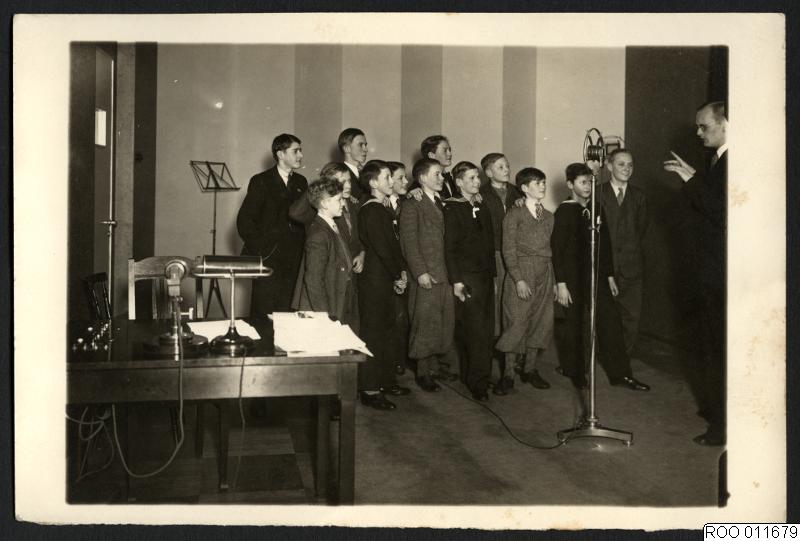 Radioinspelning i studio med en samling barn och ungdomar.Okänt år.