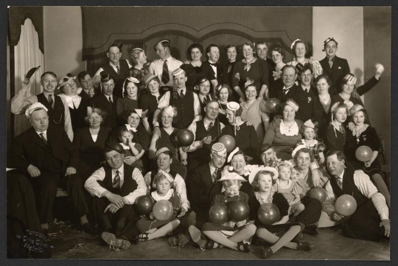 • En grupp män kvinnor och barn med ballonger och partyhattar. Okänt årtal.