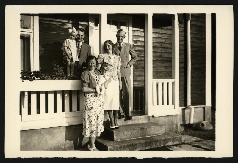 • Grupp med två män, två kvinnor, en flicka och ett spädbarn utanför ett hus. Okänt år