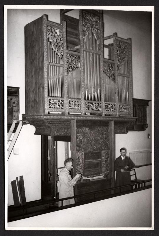 • Orgelbyggare på Malmöhus slott, den gamla 1400-tals-orgeln från S:t Petri kyrka i Malmö, som överflyttades till Malmö museums kyrka, håller nu på att uppmonteras av orgelbyggare Mogens Low, från den gamla förnämliga orgelbyggarefrmran Frobenius & C:o i Kongens Lyngby och hans medhjälpare Arvid Laerkesen. Bilden visar de båda orgelbyggarna i arbete