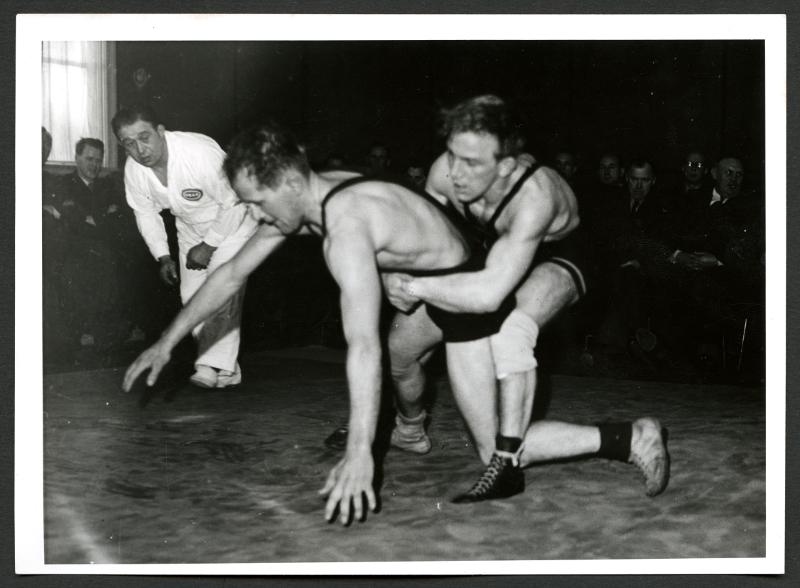 • SM. i brottning Eslöv - Eskilstuna, fjädervikt. Sven Eskilsson, Eslöv, i matchen mot Olle Anderberg, Eskilstuna. Seger.