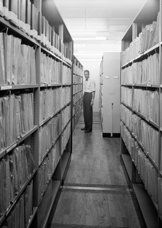 • Inomhusbild som visar magasinhyllgångar med diverse akter och mappar.