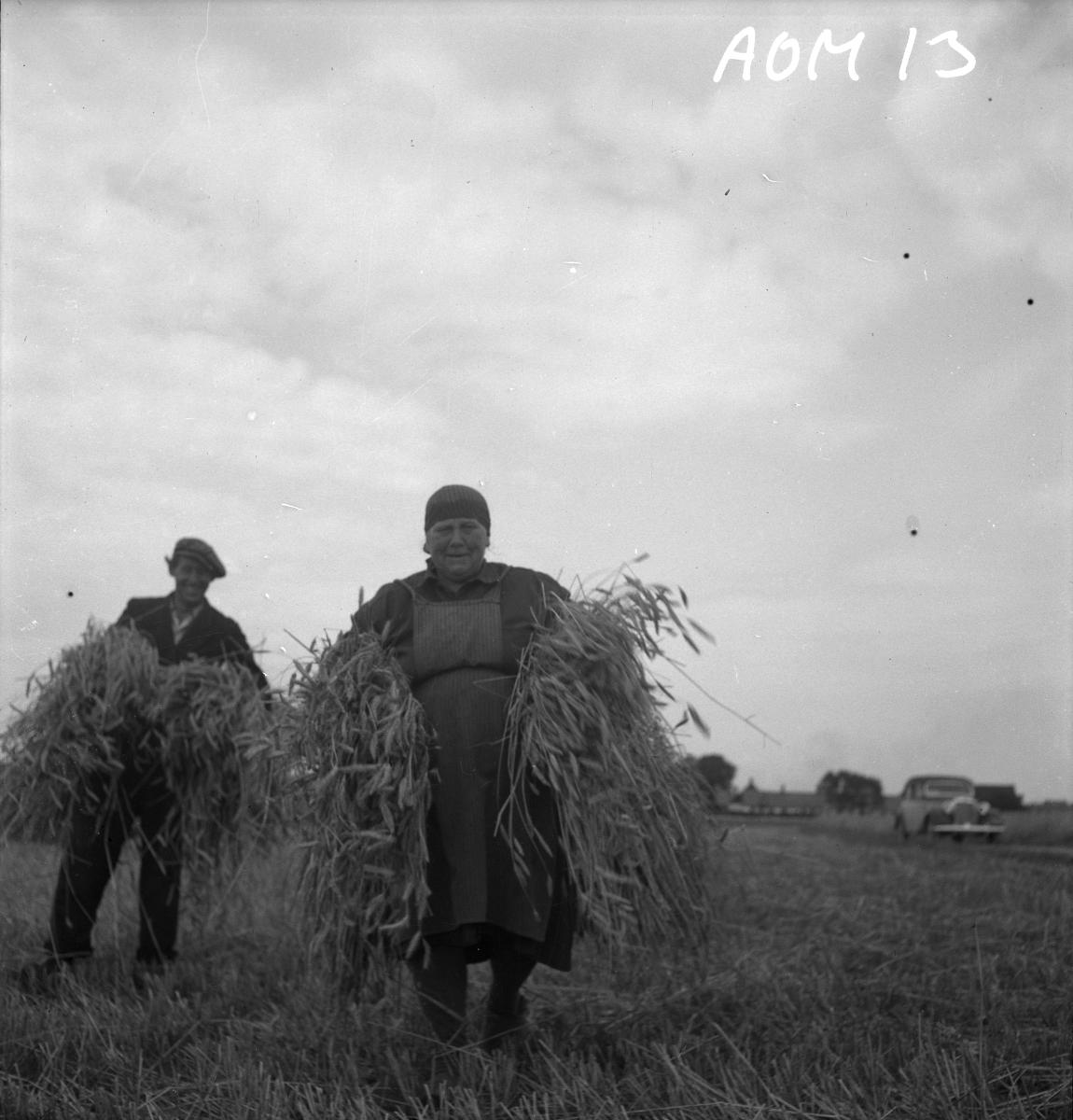 • Jordbruksbilder - Skördearbete- man och kvinna bärande på rågkärrar
