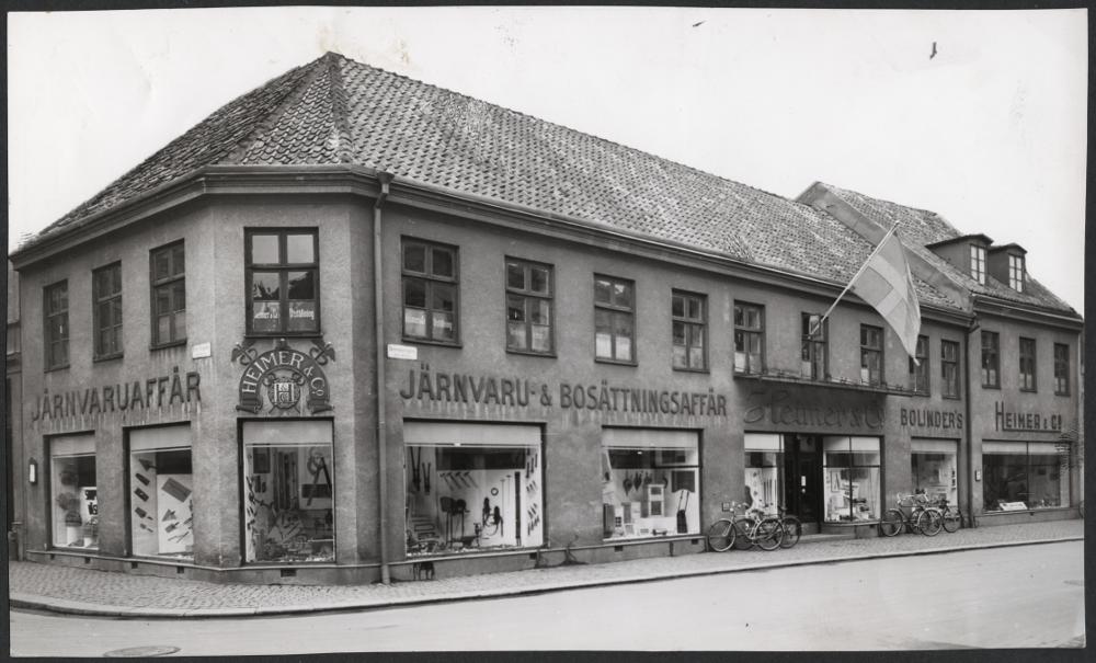 • Heimer & Co. Järnvaru- och bosättningsaffär på hörnet av Skomakaregatan/Lilla Torg. I bakre delen av byggnaden syns Bolinders.
