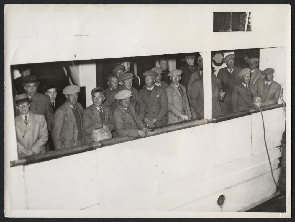 • De frigivna Spanienkämparna. På fredagskvällen anlände de frigivna Spanienkämparna med Köpenhamnsbåten till Malmö. Bilden visar Spanienkämparna vid ankomsten.