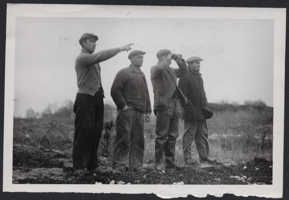 Tysk mina i ålbottengarnet. Fiskare i Böste fann på lördagen en tysk mina i sina ålbottengarn. Minan observerades dagen innad drivande utanför Telleborg. Bilden visar ett par av fiskarna i Böste spejande mot havet under ilandföringen av minan.