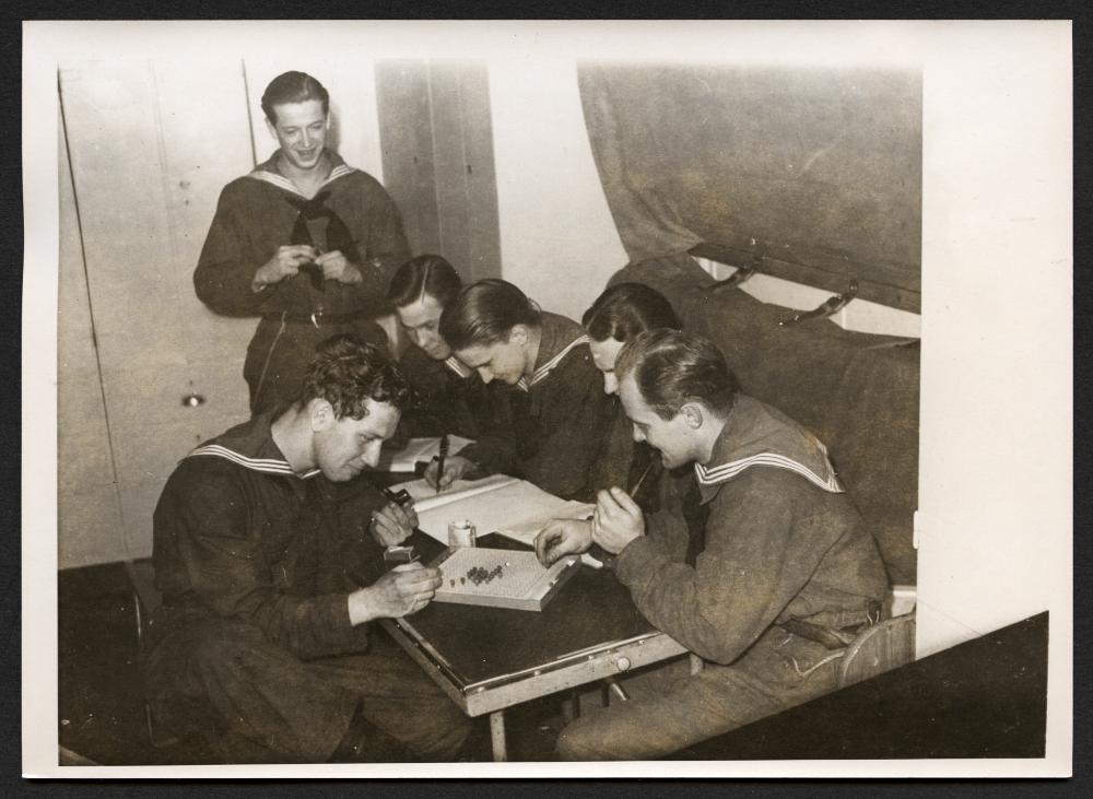 "Fylgia" i Malmö. H.M. Pansarkryssaren Fylgia har anlänt till Malmö och förtjöjt vid nyhamnen. Besök ombord beredes för malmöborna under söndagen. Bilden visar yngsta kullen aspiranter representerade av några kadetter, som pluggar navigering.