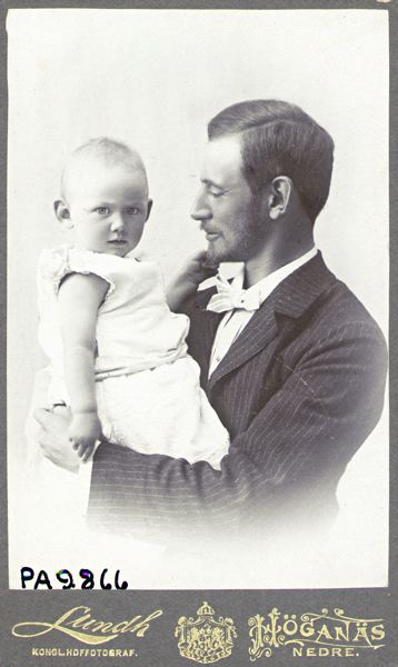 Porträtt av Albert Lindahl med dottern Britta i famnen. Britta är kusin till givaren Rolf Ståhle.Har varit monterat i fotoalbum, MMI 18.