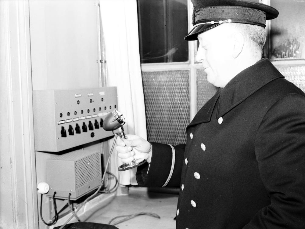 • Inomhusbild som visar en man som bär uniform på en kommandobrygga som håller i en mikrofon.