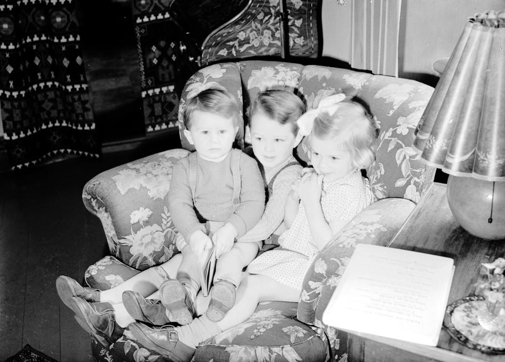 • Inomhusbild som visar två pojkar och en flicka som sitter tillsammans i en fåtölj.