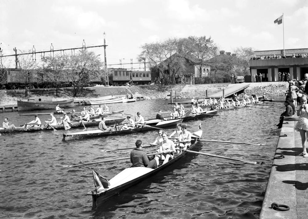 • Utomhusbild som visar en roddtävling på Malmö kanal. I bakgrunden syns järnvägsvagnar och roddklubbens lokaler.