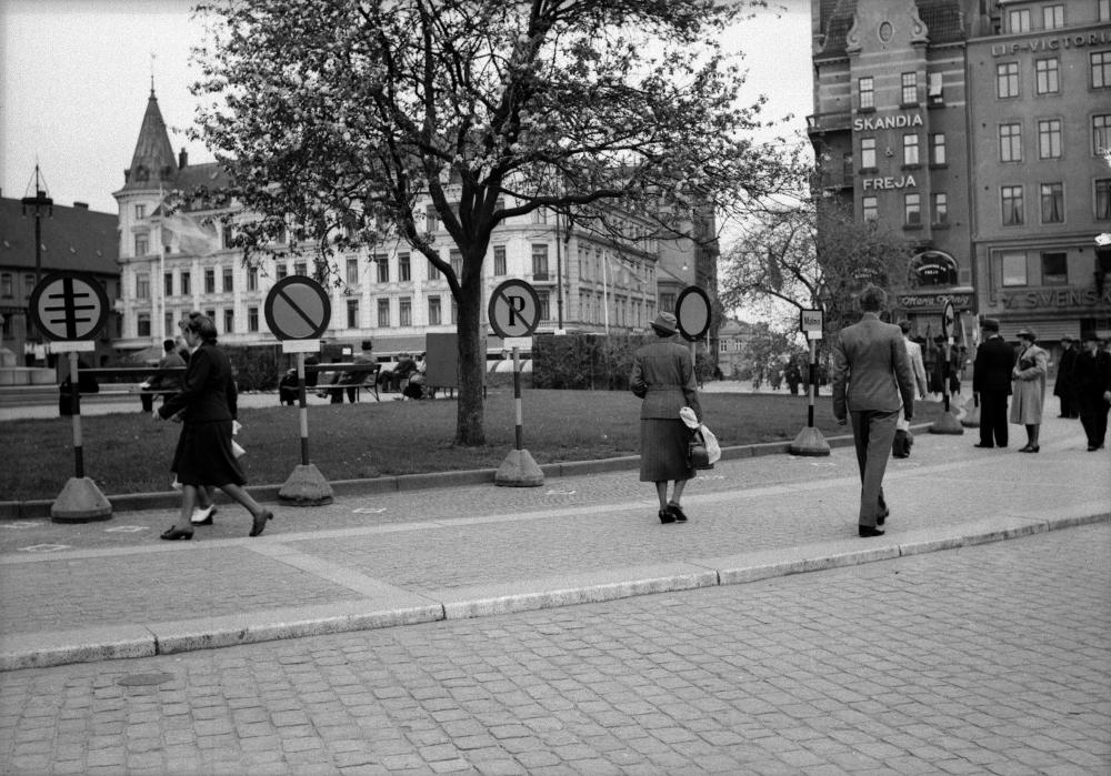 • Trafikveckan i Malmö i maj 1938. Trafikskyltar på Stortorget.