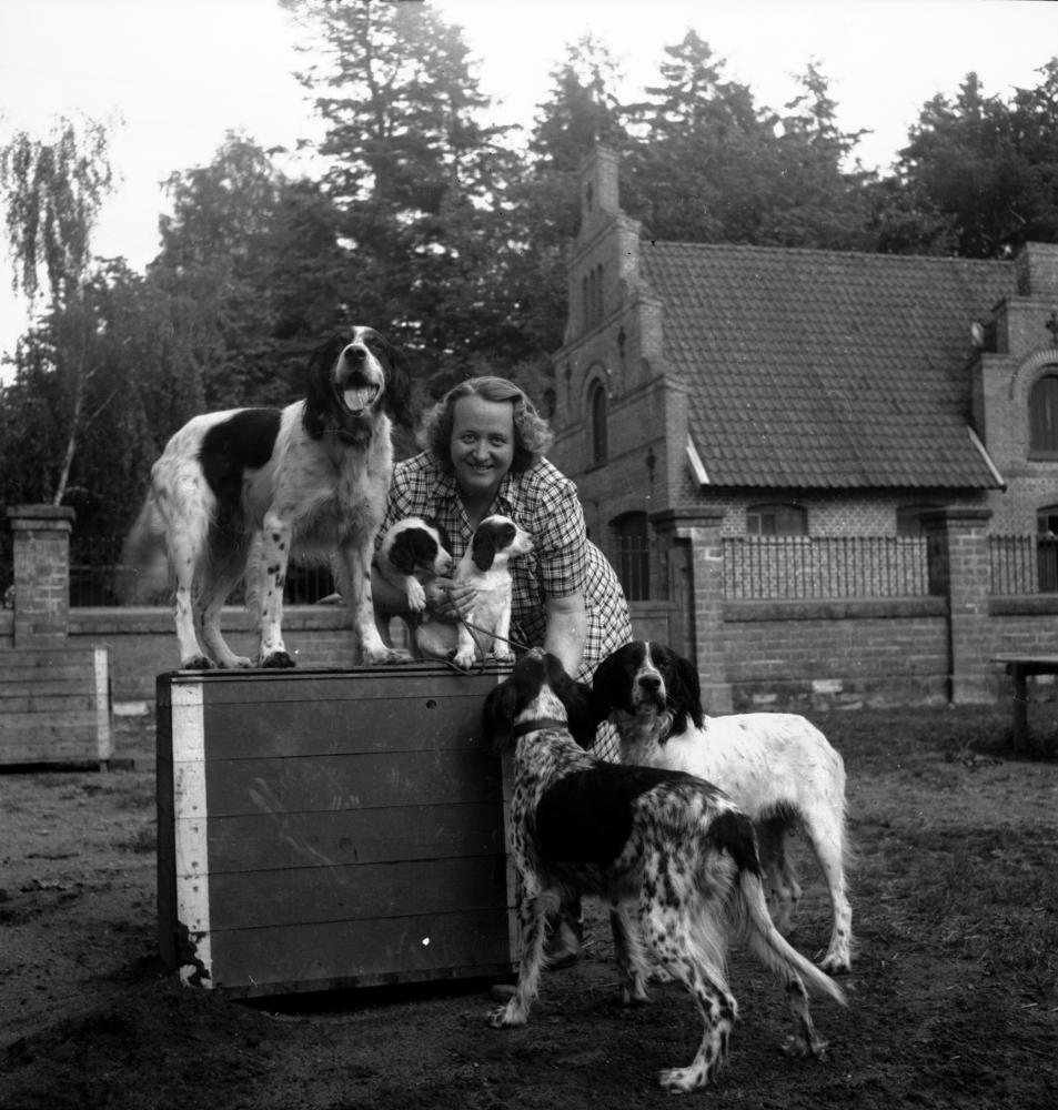 Kvinna med hundar i trädgården vid grevinnan Stjernsvärds Sövdeborgs slott, Skåne.