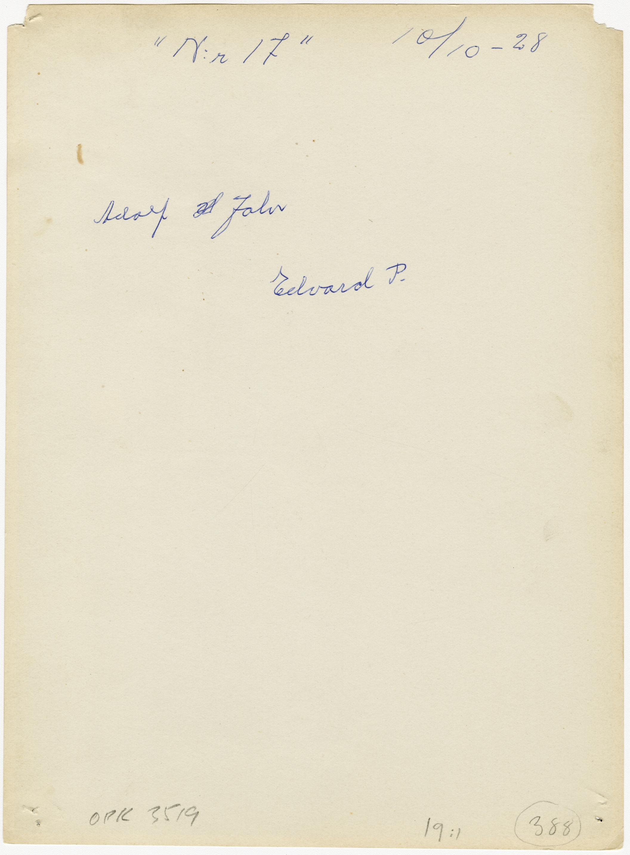 Påskriften lyder: ""N:r 17" 10/10 -28Adolf JahrEdvard P.". Nere i högra hörnet står "19:1 388" (388 inom en cirkel).
