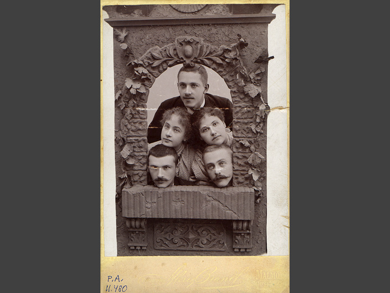 • Visitkortsfotografi. Porträtt av Leonard och Alma Sterregaard tillsammans med Paul och Nelly Walde, samt, möjligen, Hans Hörup. Fotograferde i fönsterkuliss.