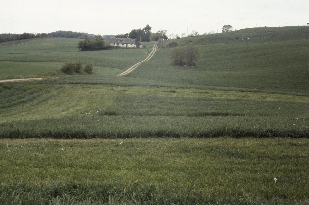 fält, åker, kullar, väg, kulle, hus, landet, gräs
