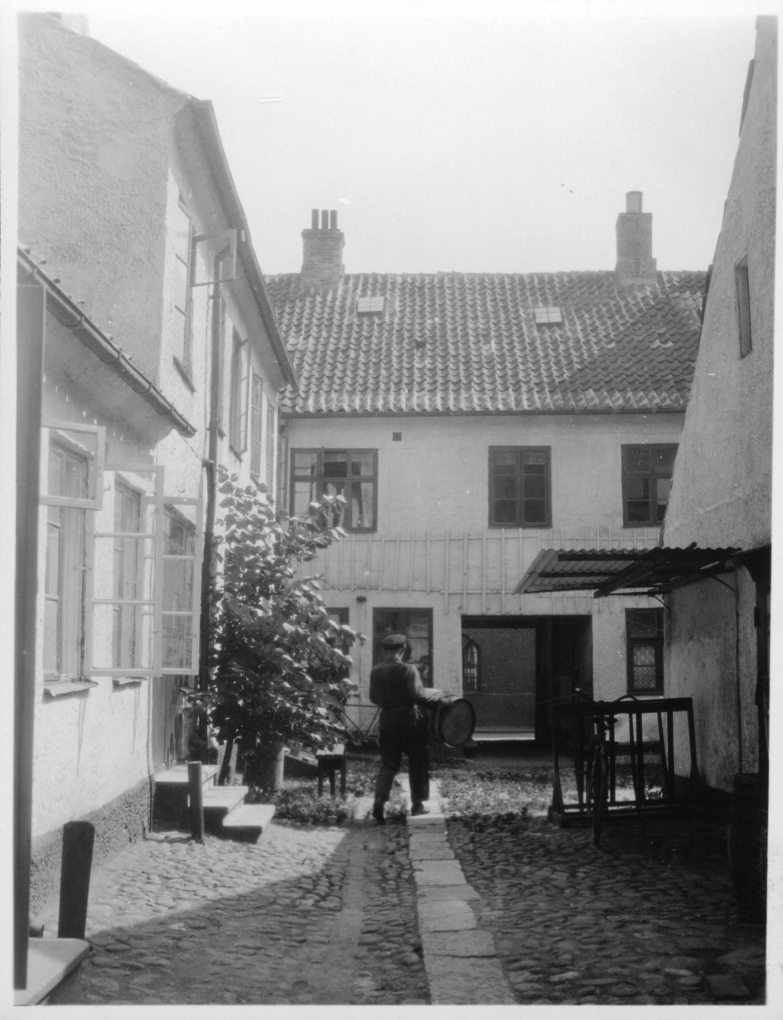 • Gårdsinteriör, en man bärande en tunna, gl.nr 544 (?) vid Jöns Fils gatan mot söder