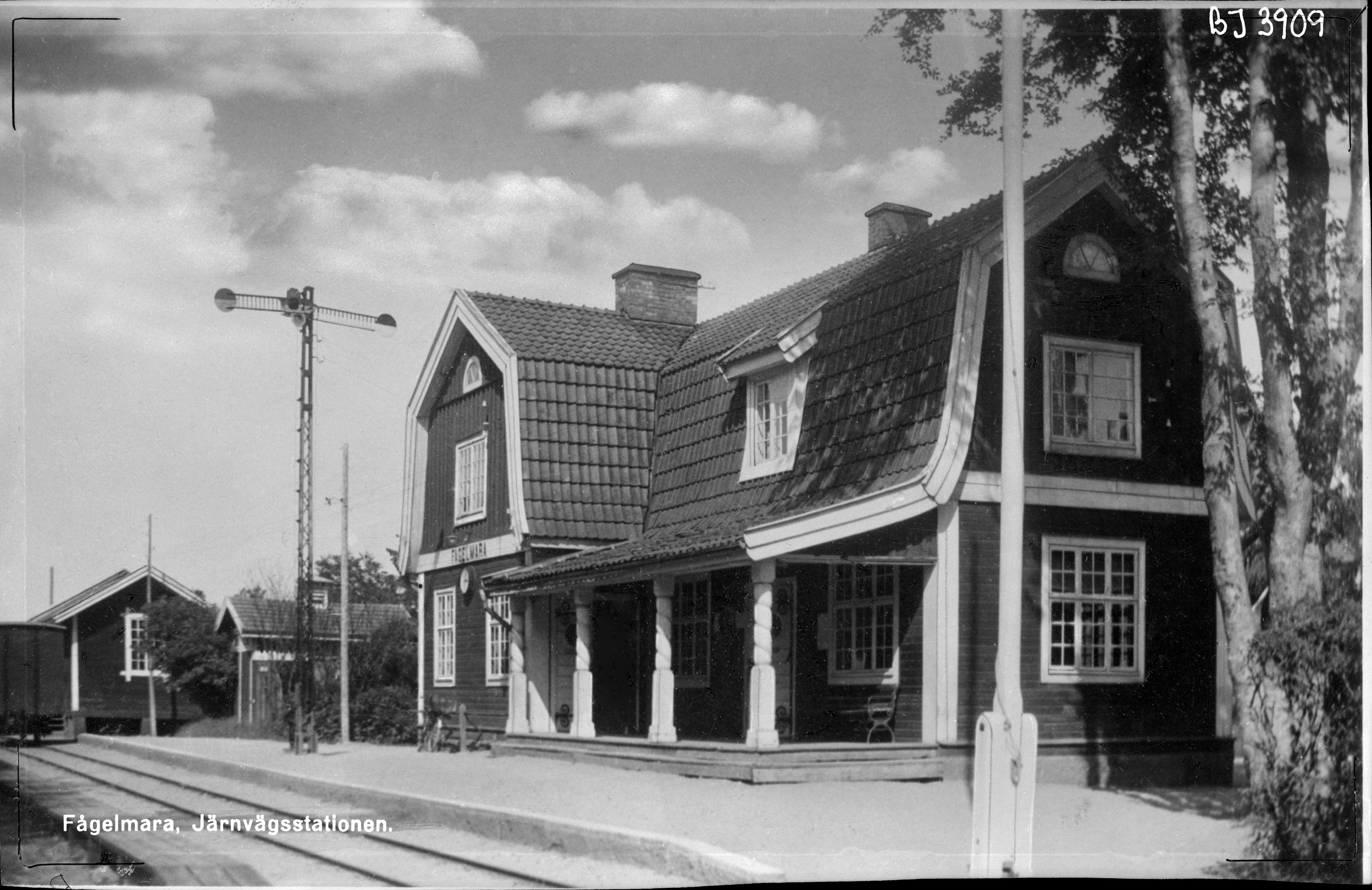 järnvägssignal, järnvägsstationshus, träd, järnvägsstation