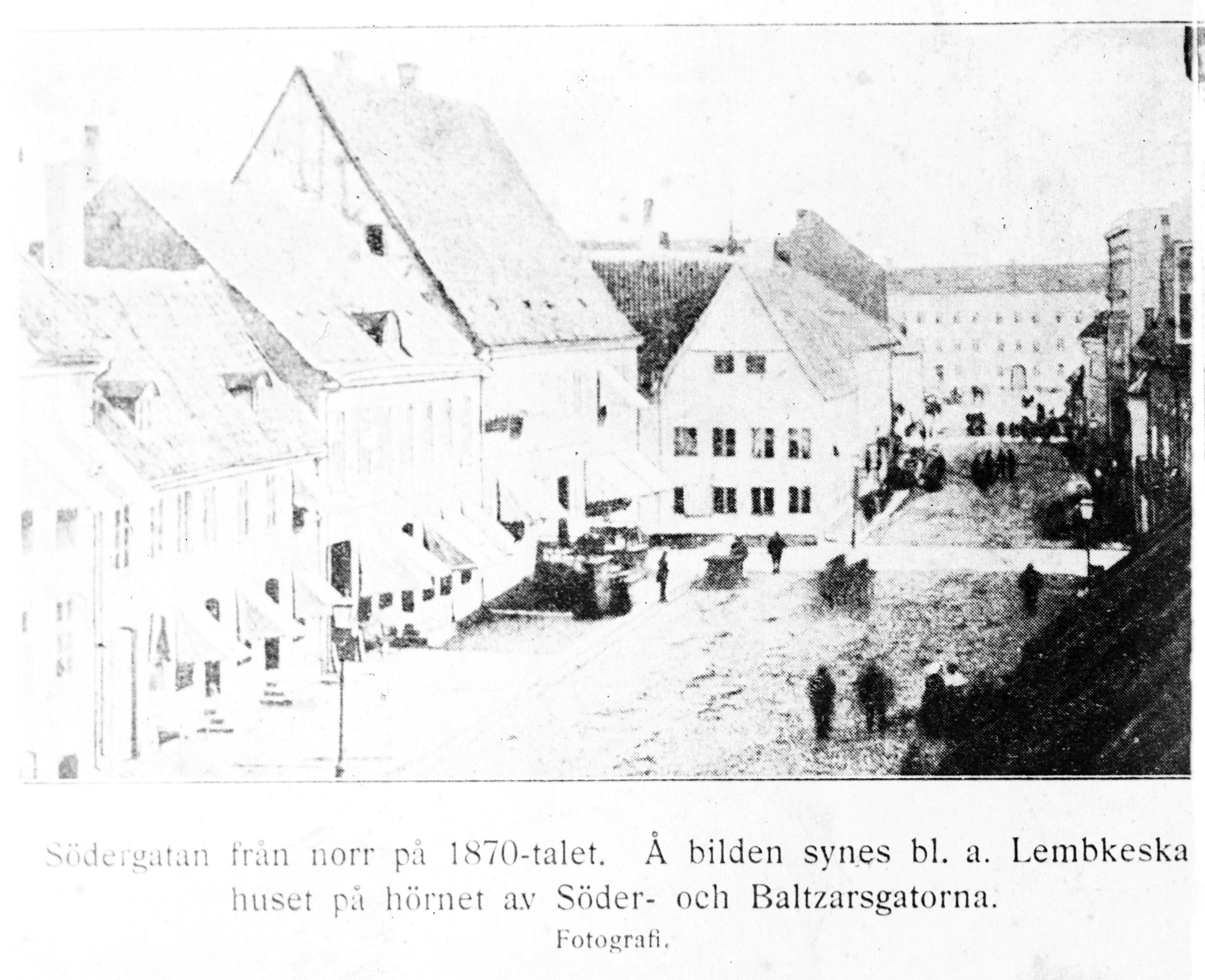 • Södergatan från norr på 1870-talet, Lembkeska huset syns på hörnet av Södergatan och Baltzarsgatan.
