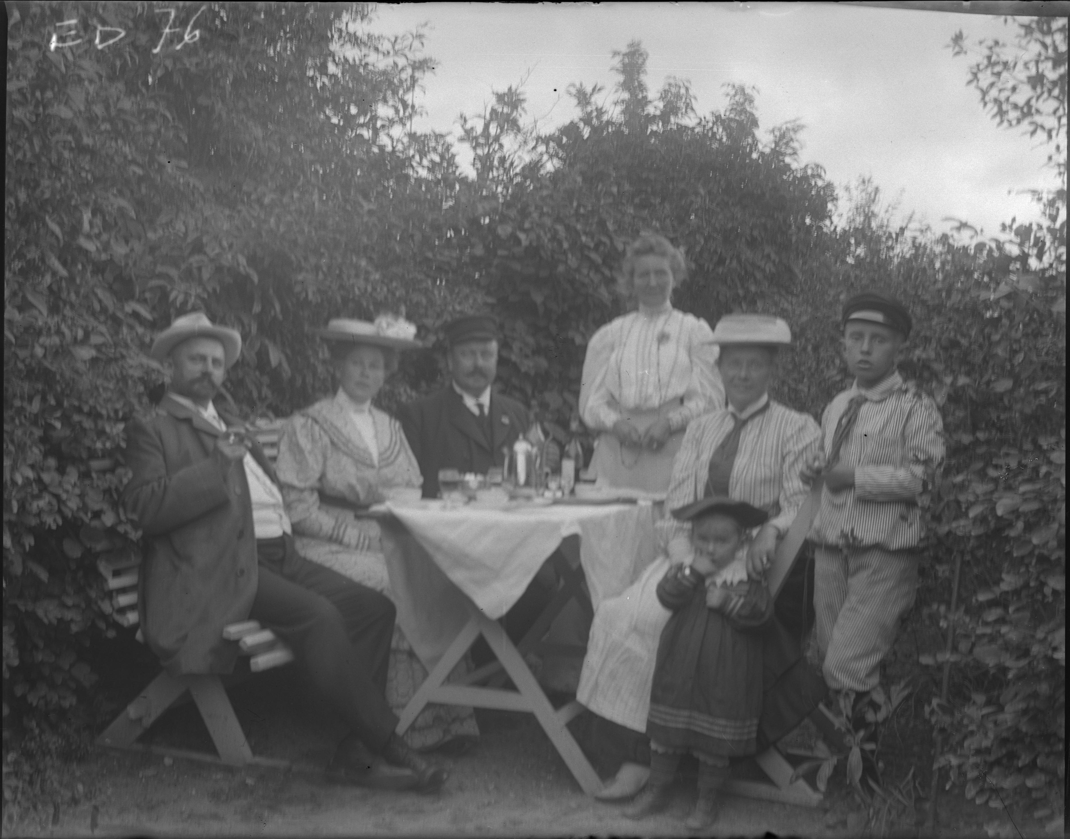 • Sällskap kring ett trädgårdsbord, andra t. h. Magda Lassen, son och dotter ?