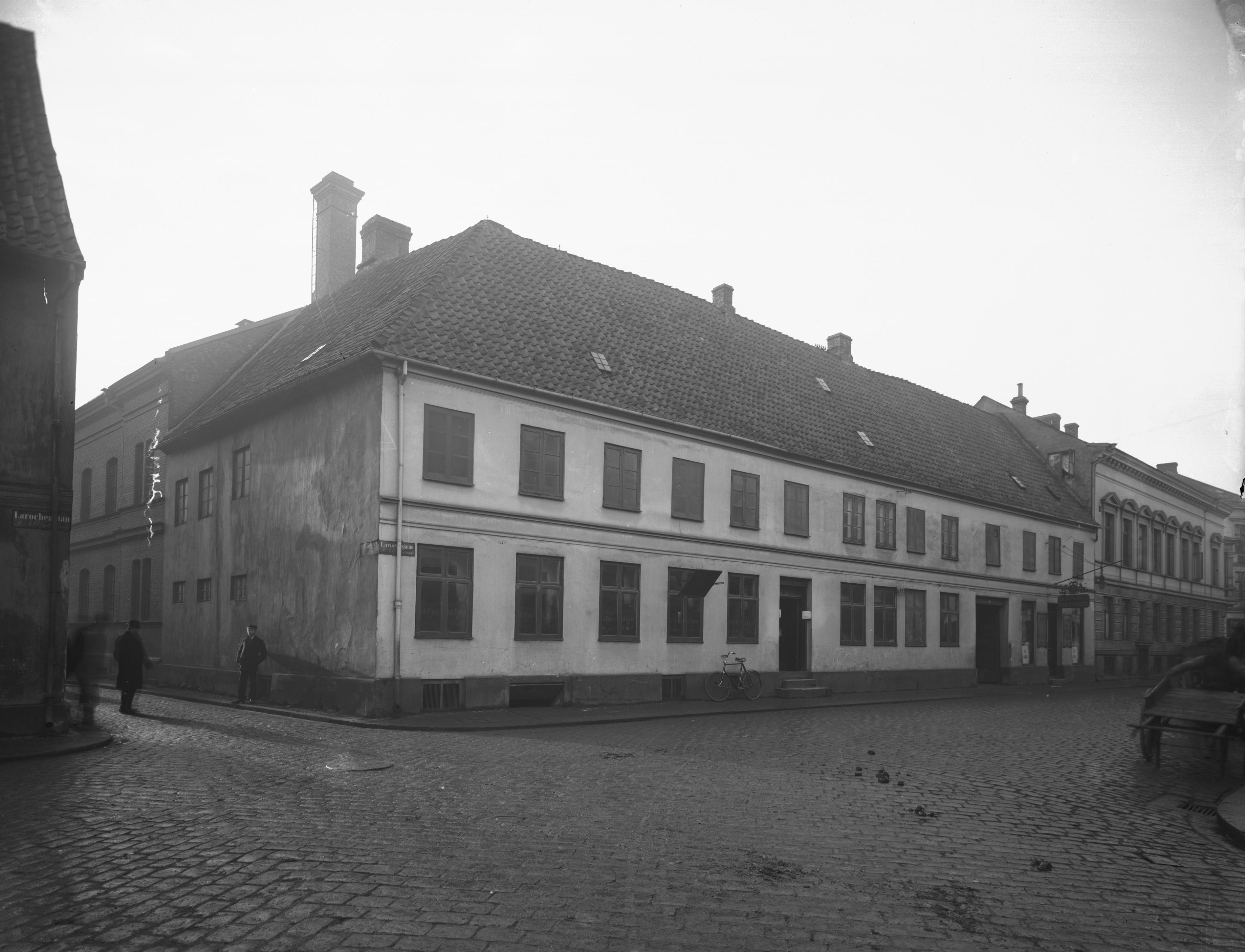 • Faxeska gården, Larochegatan 4. Fasad åt gatan, innan murputsen avlägsnats. 1910.