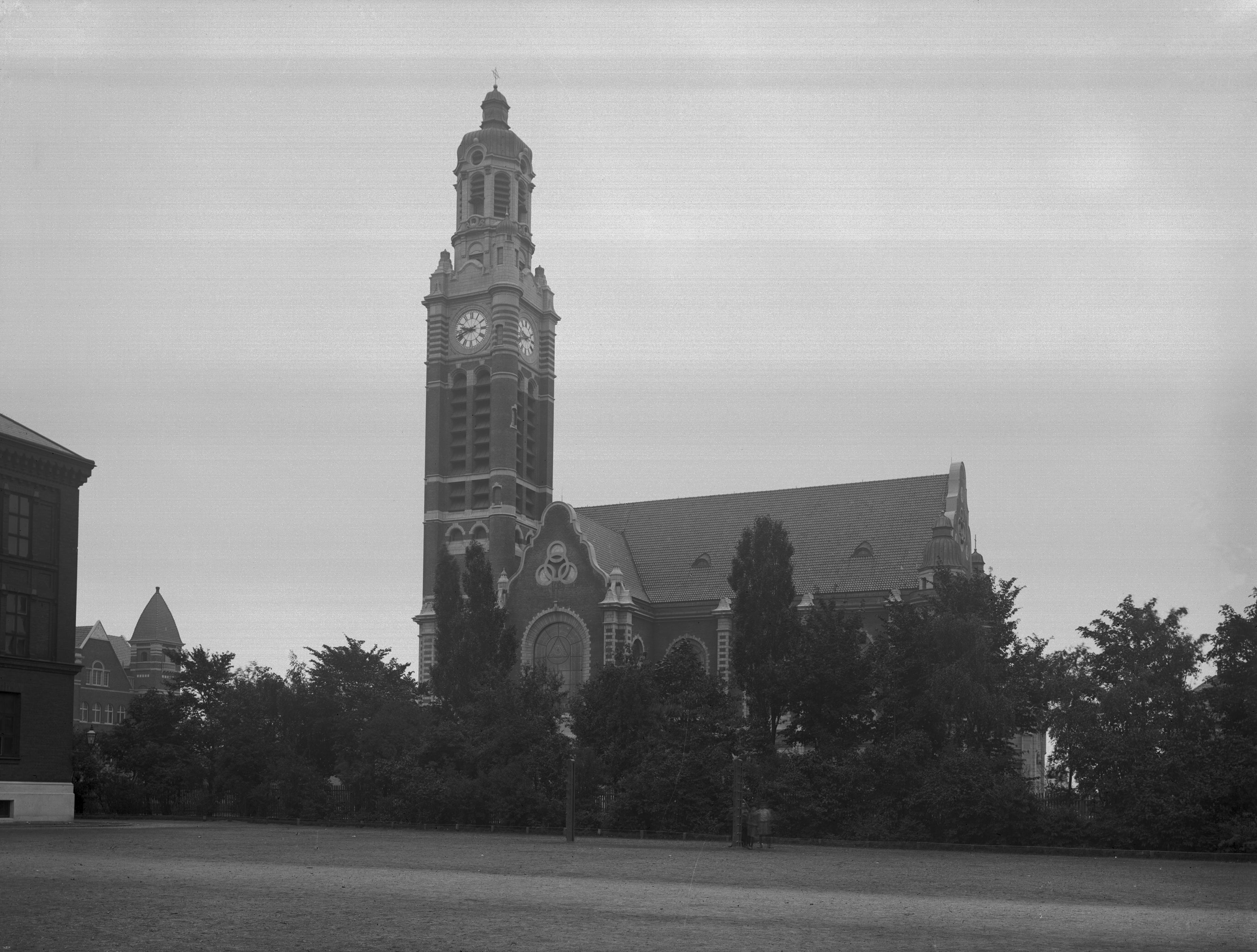kyrka, ur, folkskola, träd, staket, skolelev