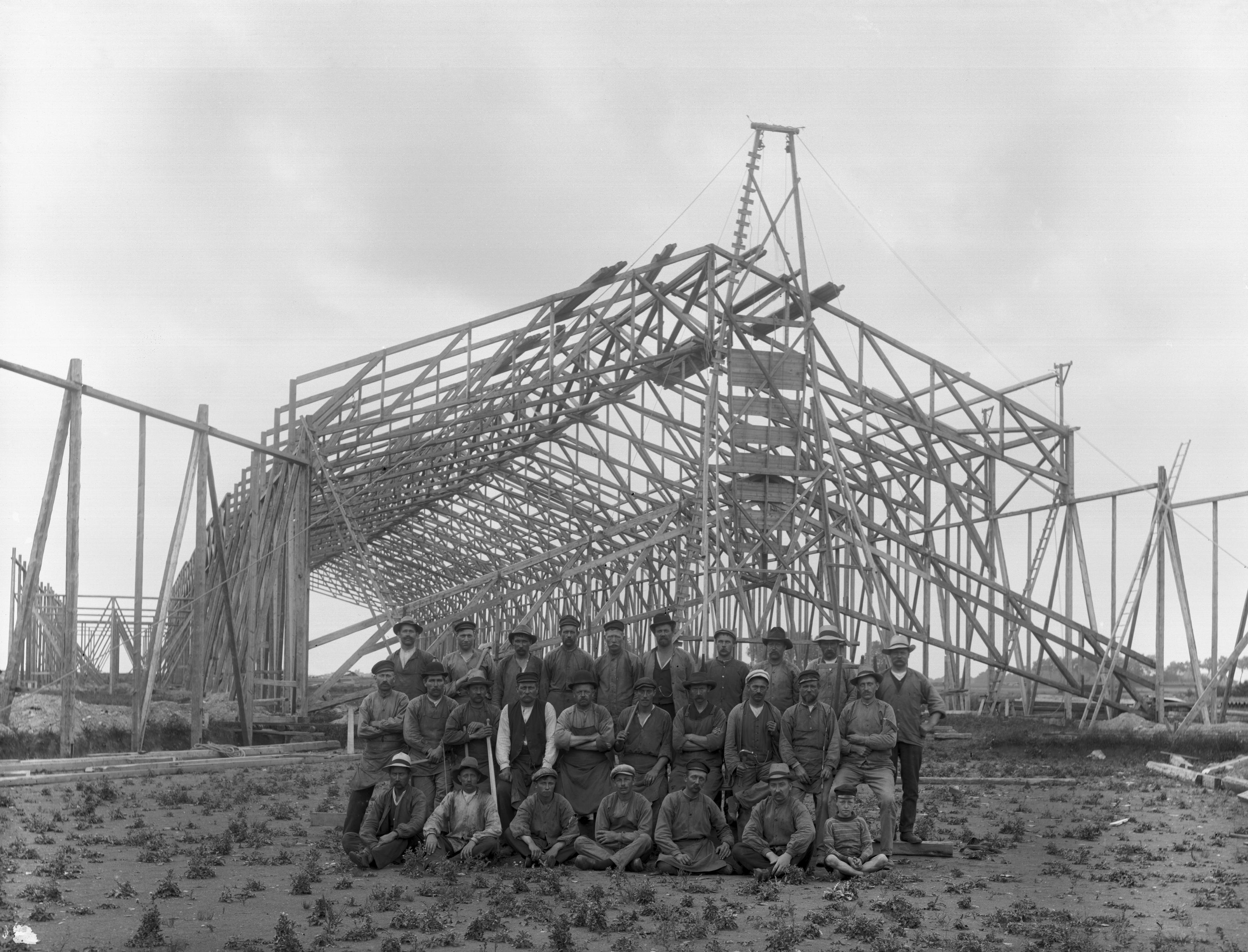 • Baltiska utställningen under byggnad. Gruppbild av byggnadsarbetare. Industrihallen. 1913.
