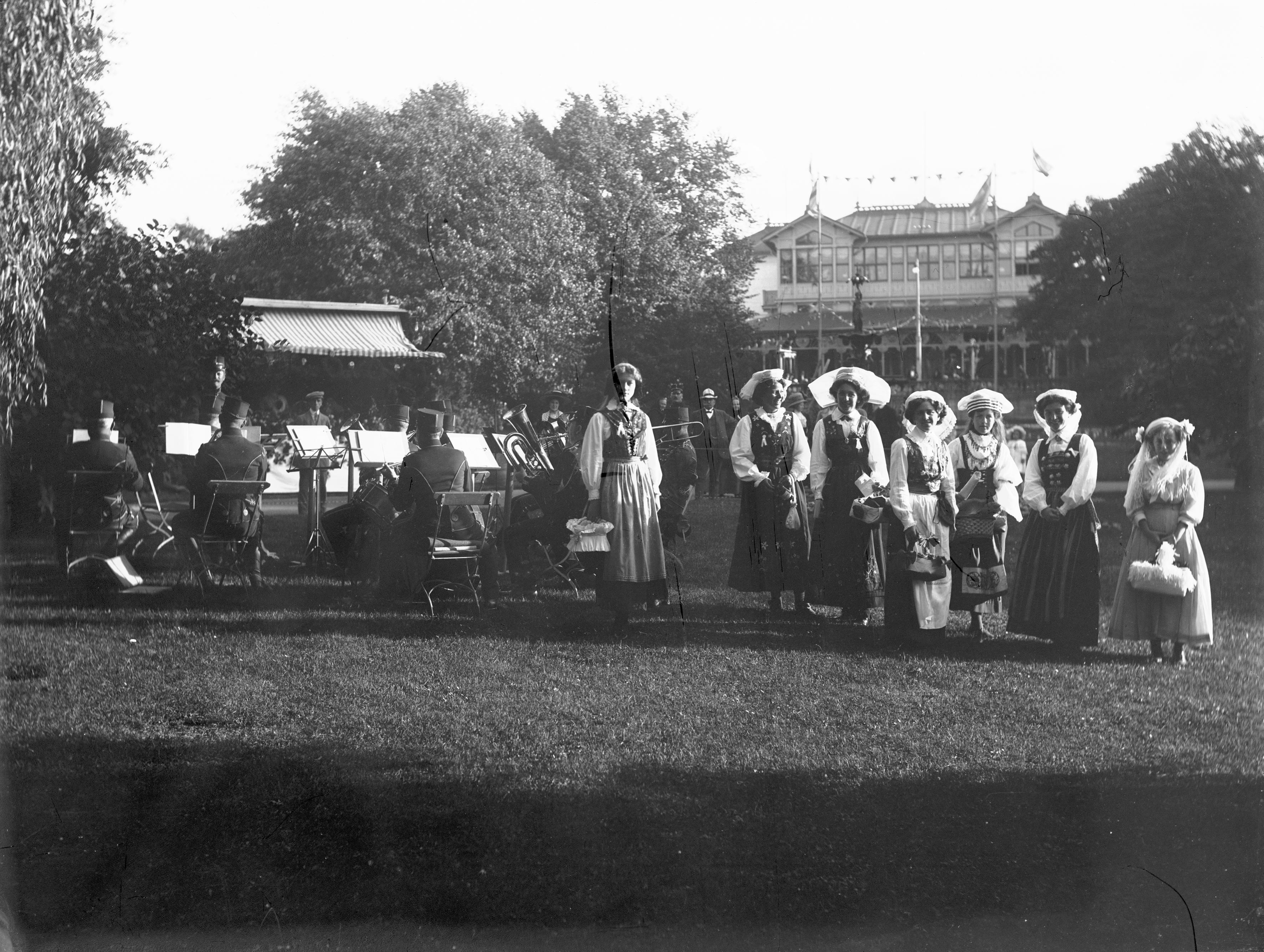 • "De gamlas dag" med musicerande orkester den 15 och 16 september 1911. Gruppbild av musiken och medverkande i nationaldräkt.