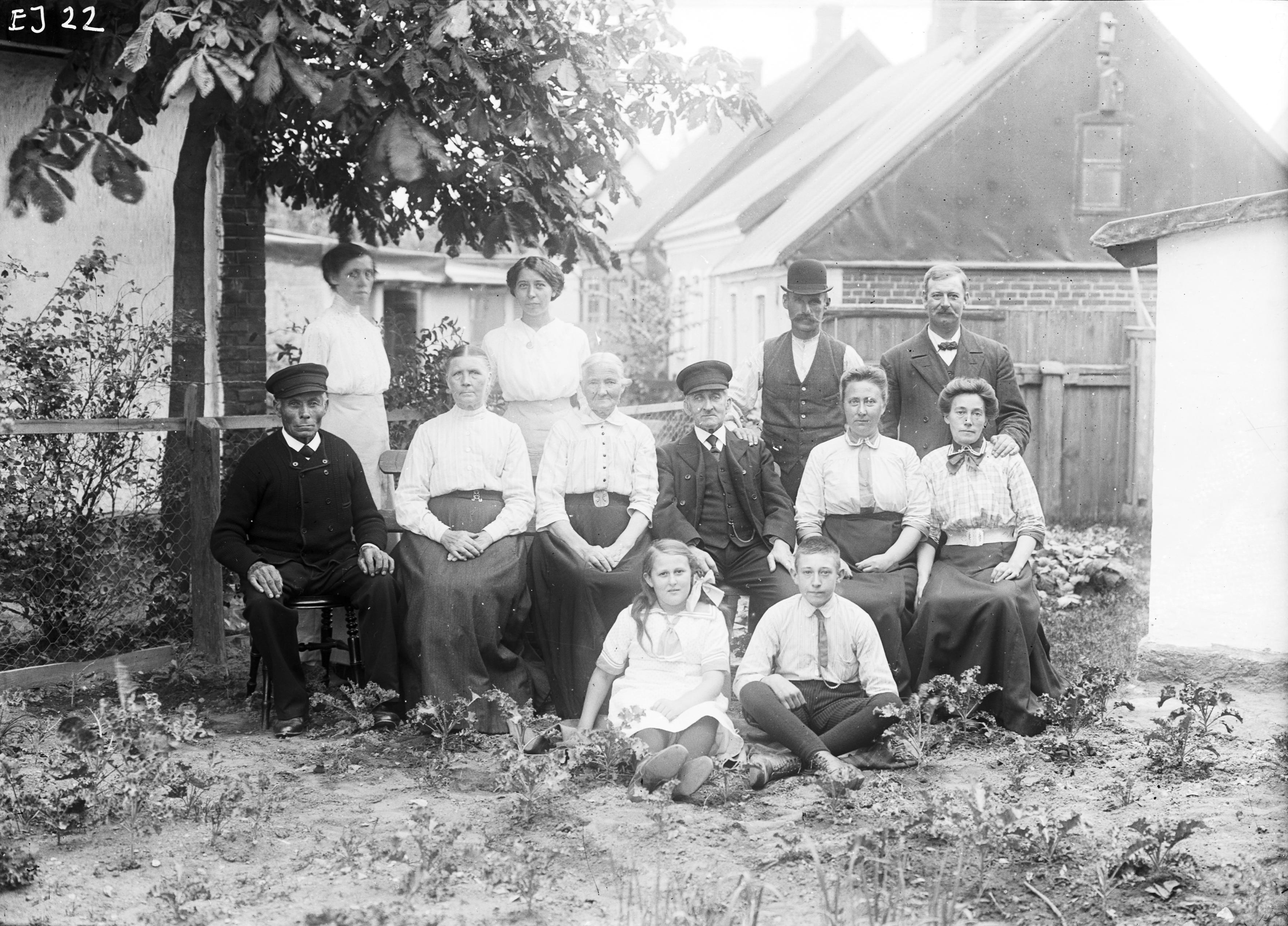 • Valby gränd. Familjerna Borg och Larsson och Teodor Hansson. Gruppbild 12 personer på en gård.