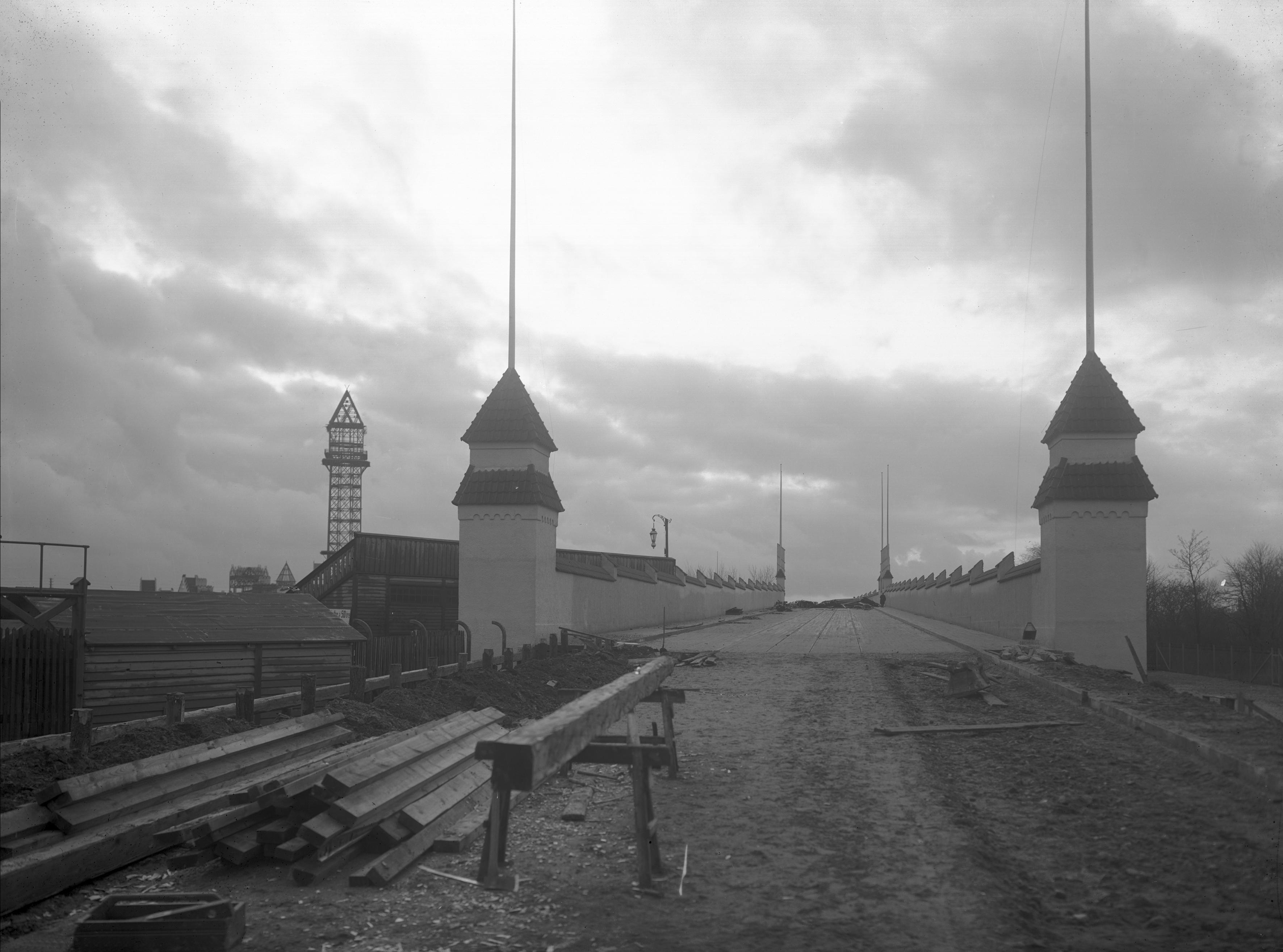• Byggandet av Baltiska utställningen. Viadukten mot sydväst den 3 december 1912. I bakgrunden Stora Tornet.