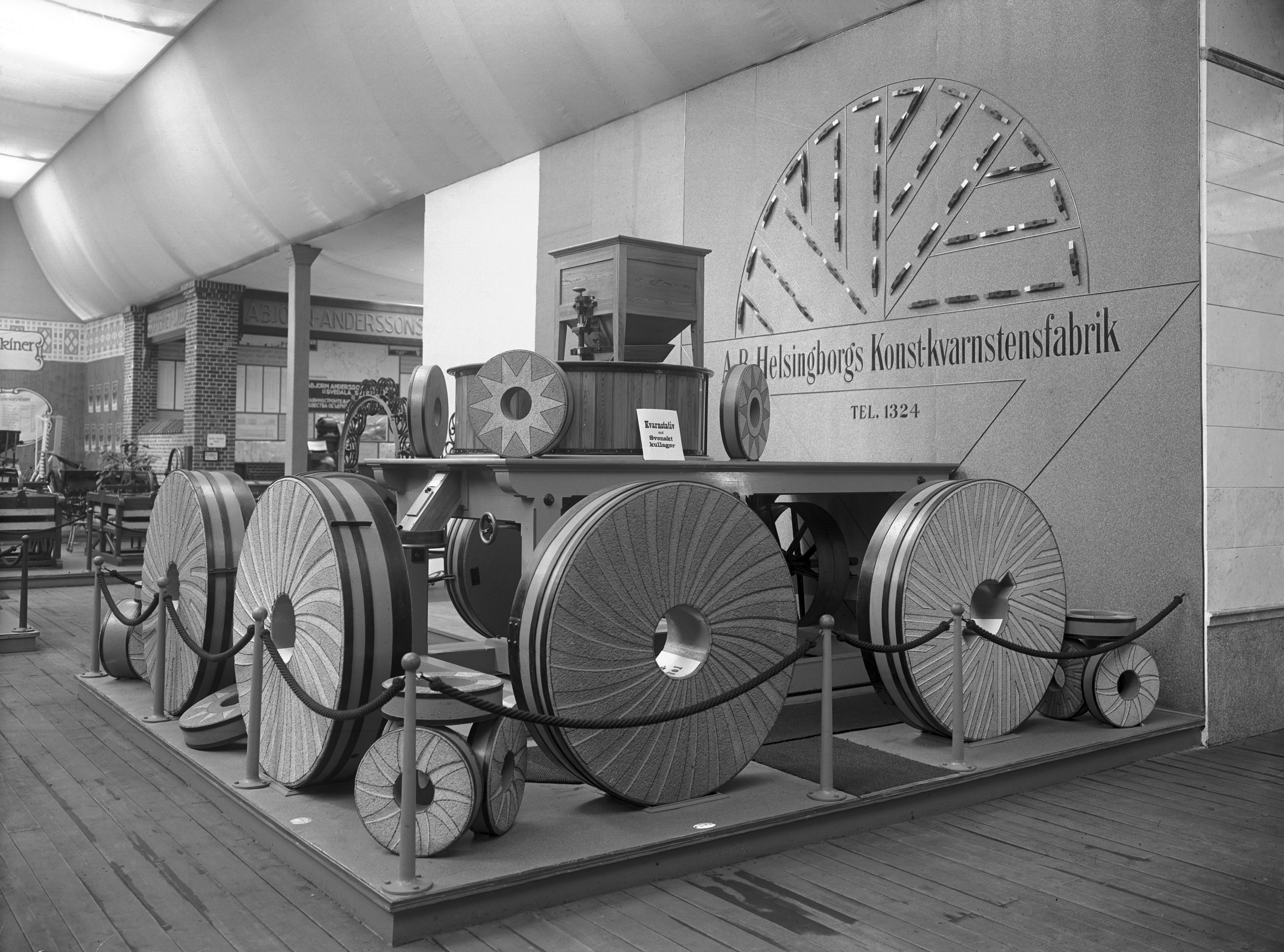• Baltiska utställningen. AB Helsingborgs Konst-kvarnstensfabrik. Kvarnstativ med Svenskt kullager och konstkvarnstenar.