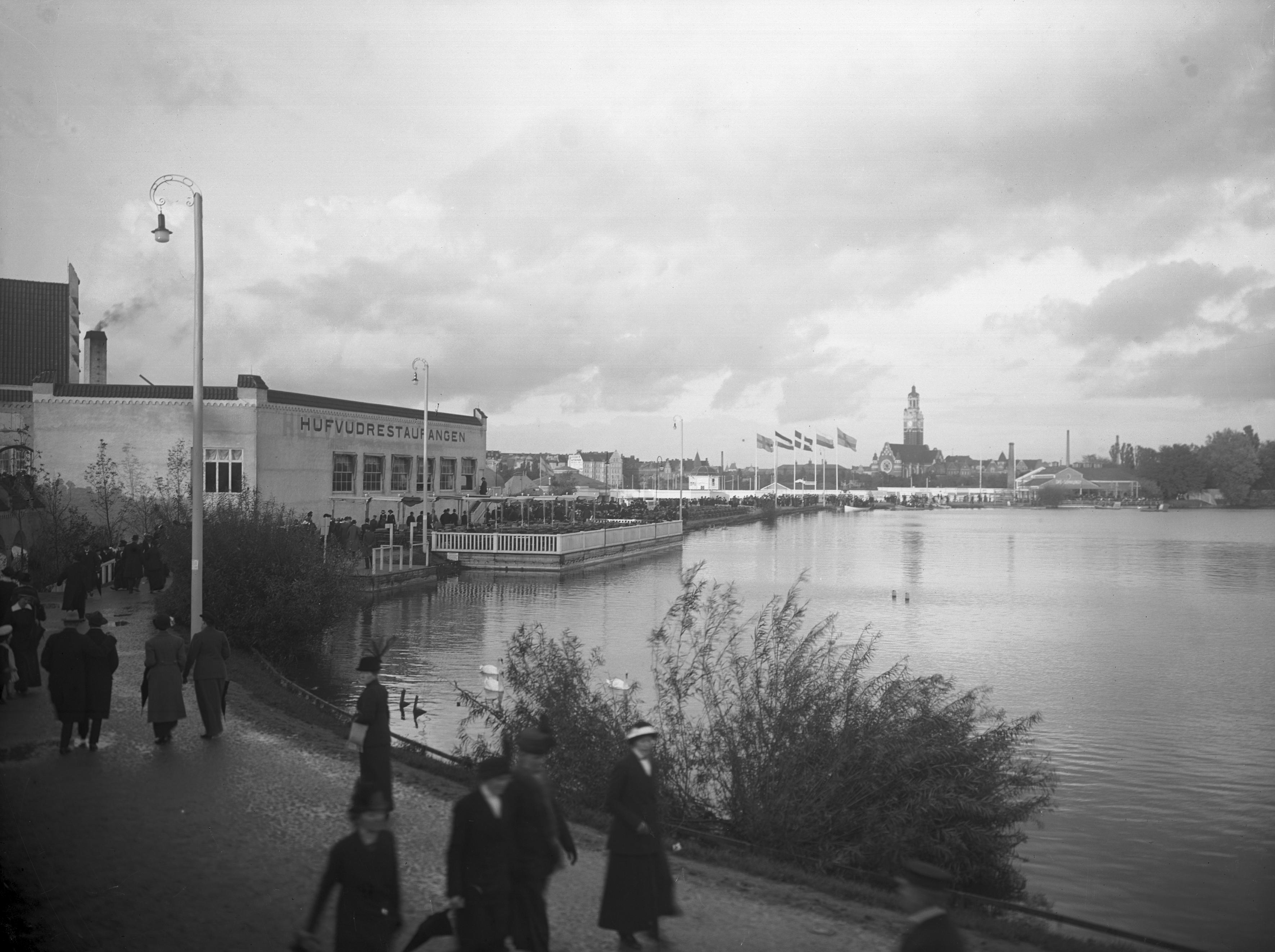 • Storsjön från Fiskerihallen mot Huvudrestaurangen. Deltagarländernas flaggor i bakgrunden (Sverige, Tyskland, Danmark, Ryssland och Sverige).