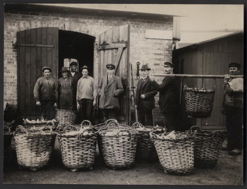 • Gruppbild av män med stora korgar